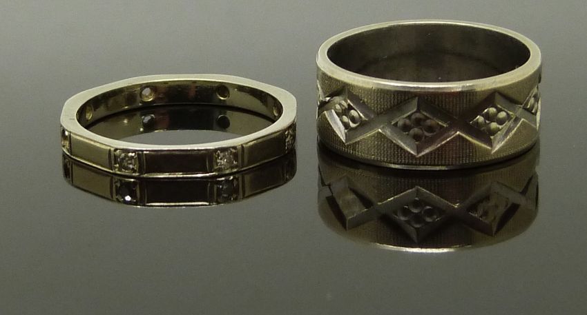 An 18ct white gold ring (1.6g) and a 9ct white gold ring (3.2g), size J & H/I