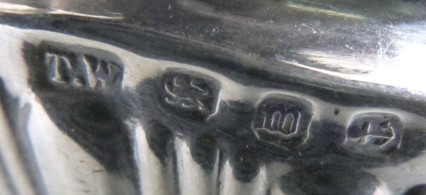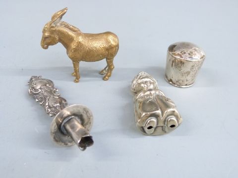 Three Victorian Walker and Hall wrythen hallmarked silver salts, Sheffield 1893, hallmarked silver mustard, bottle ticket etc, weight 124g together with a novelty tape measure body formed as a donkey and a baby's rattle formed as a girl