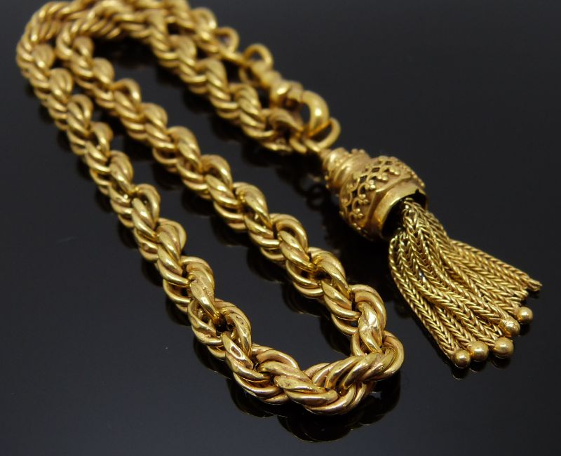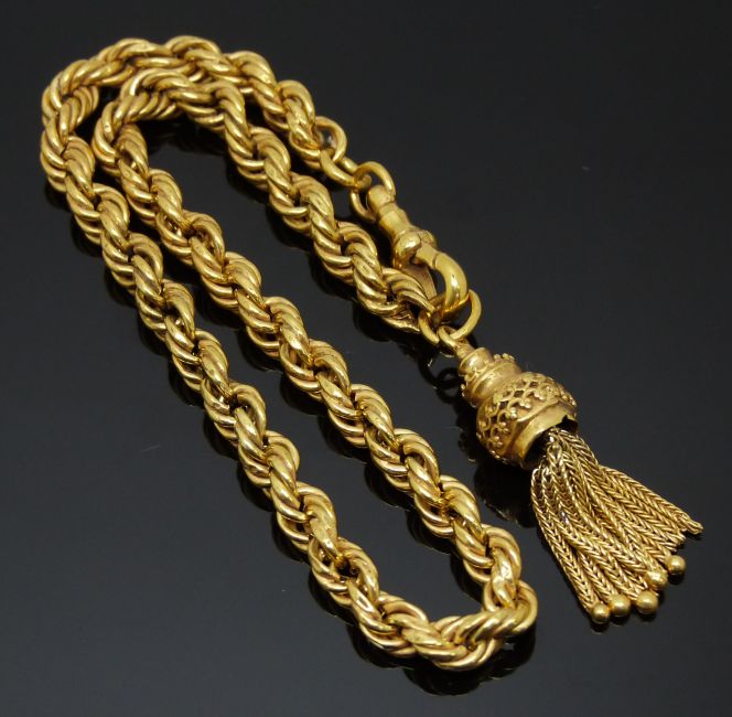 A 19thC yellow metal rope twist leontine/ fob chain with a tassel, 13.7g