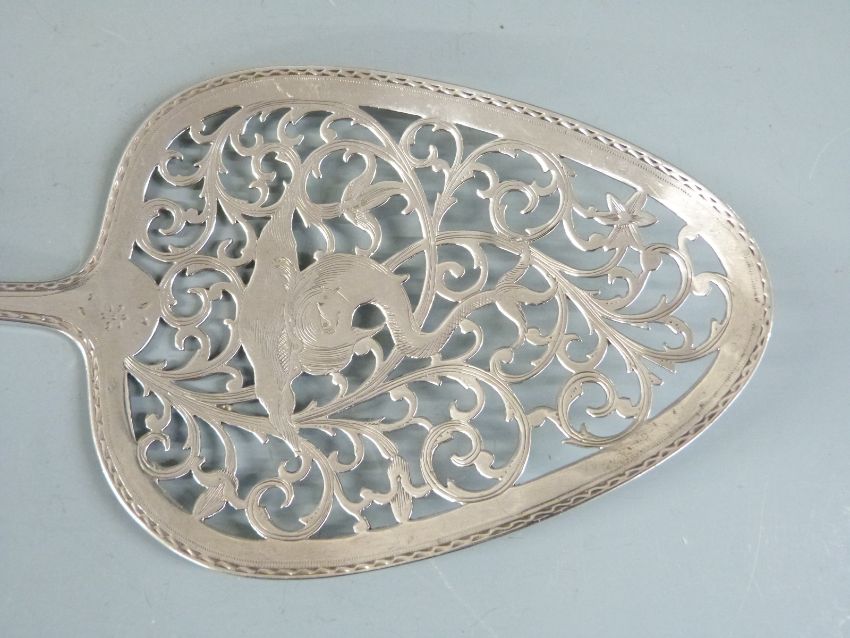 Irish Georgian hallmarked silver Onslow pattern fish serving slice with pierced and bright cut decoration, Dublin 1779 maker Joseph Jackson, length 35cm, weight 142g