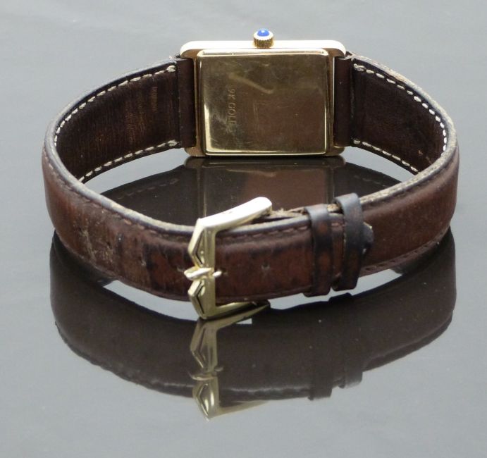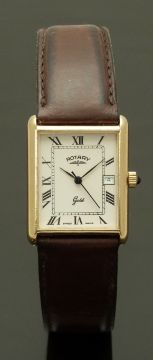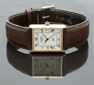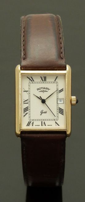 Rotary 9ct gold gentleman's wristwatch with date aperture, black hands and Roman numerals, cream dial, sapphire inset crown and quartz movement, on brown leather strap, case diameter 25mm, serial number 1426, in original box with spare strap and guarantee.