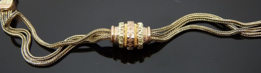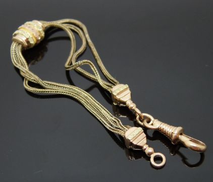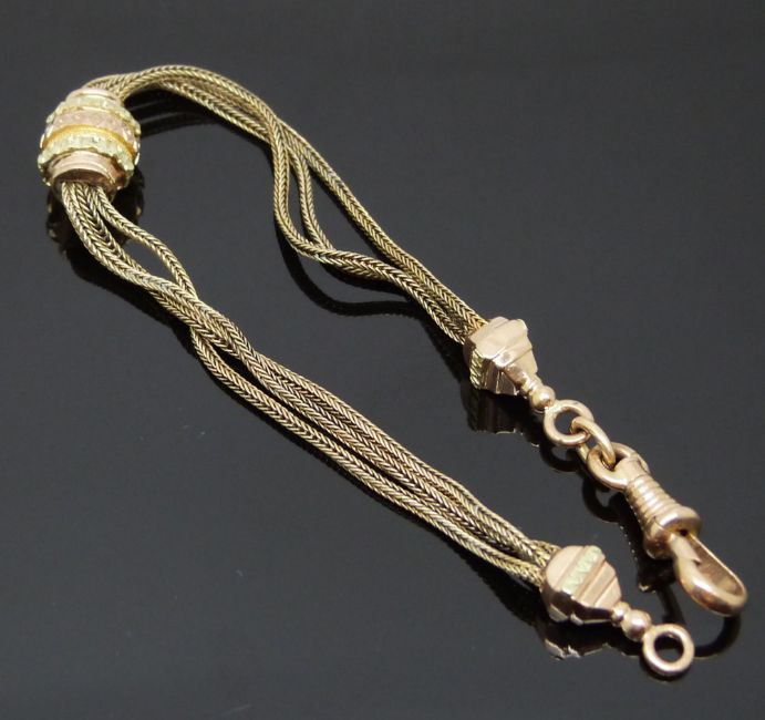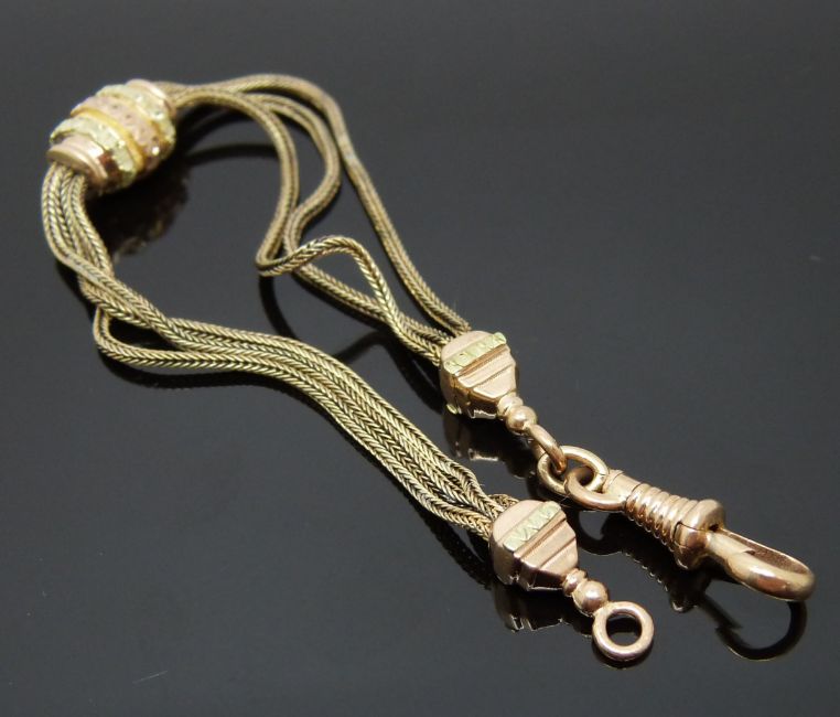 A 19thC 15k gold three strand leontine/ fob chain with bi-coloured fittings, 6.2g
