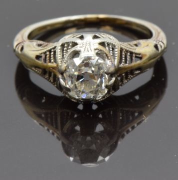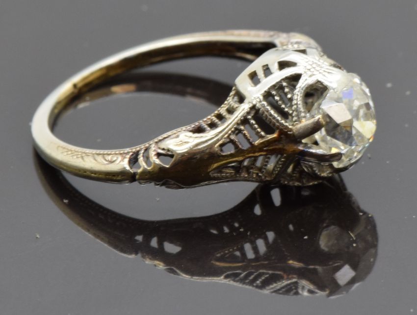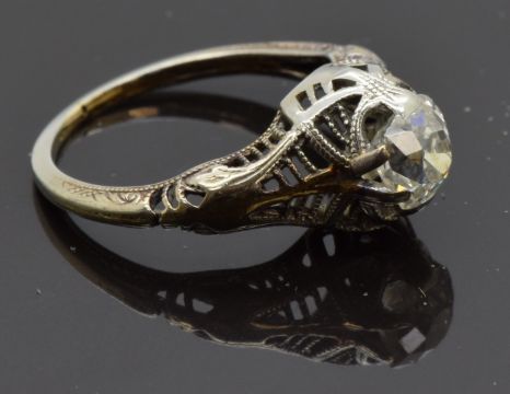 Art Deco ring set with an old cut cushion cut diamond of approximately 0.7ct in a pierced setting, size G/H, 2.20g