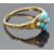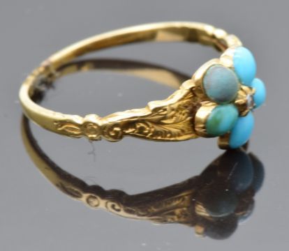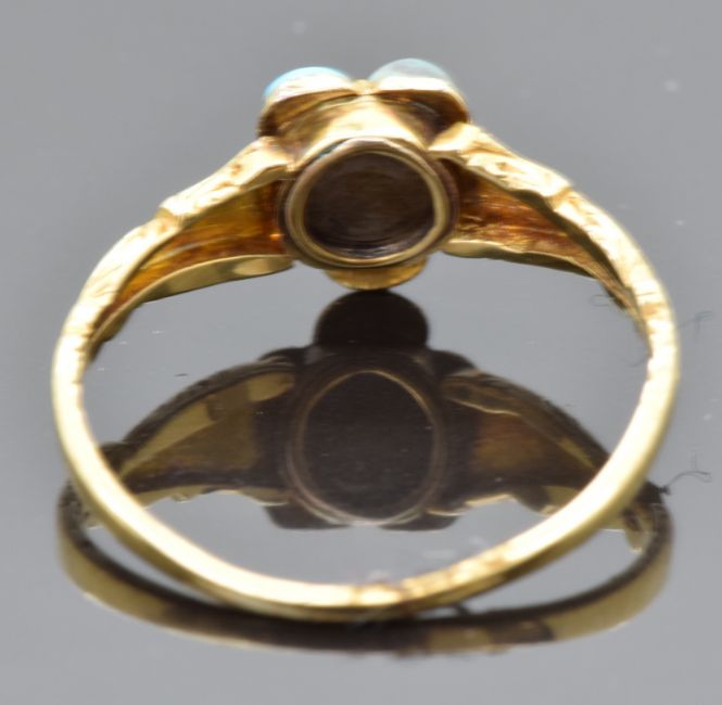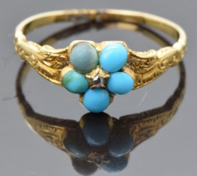 Victorian 18ct gold ring set with an old cut diamond surrounded by turquoise, with engraved shoulders and to the underside a circular glass compartment set with hair, size K