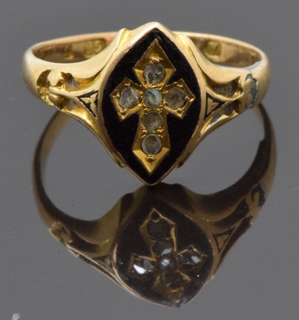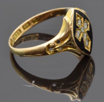 Victorian 15ct gold ring set with black enamel and old cut diamonds in a cross, Birmingham 1873, size K, 2.73g