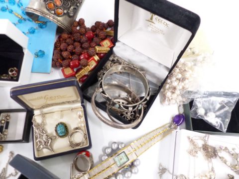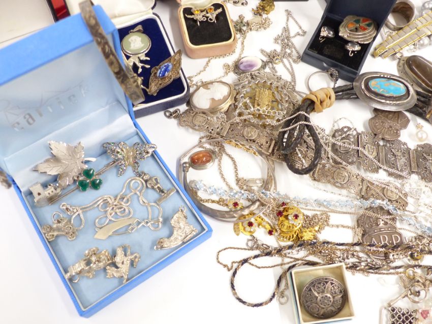 A collection of silver jewellery including necklace, Wedgwood pendant, chains, white metal locket, bangle, brooch, silver and pearl earrings, cameo, bangles, cufflinks, charms, Victorian brooch, etc