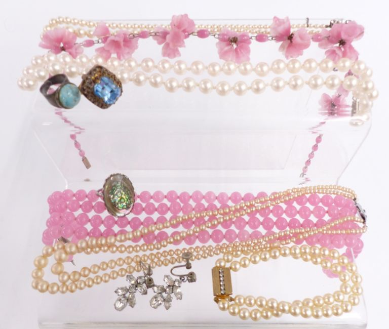 A collection of jewellery including rose quartz, adventurine quartz, vintage glass necklace, coral necklace, ivory bangle, faux pearls etc