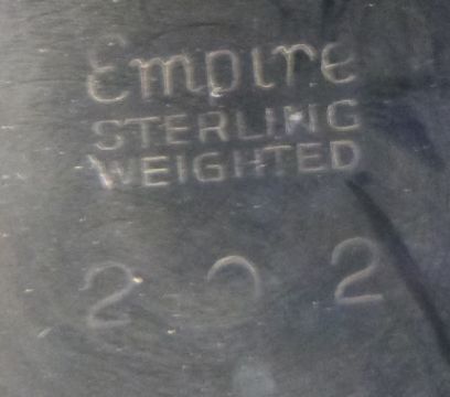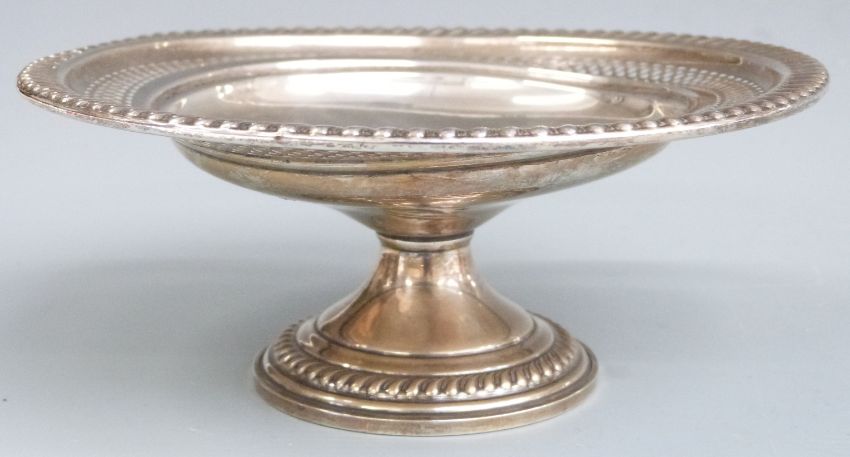 White metal pedestal tazza with pierced and embossed decoration, marked Empire Sterling weighted, diameter 17cm, weight 187g all in