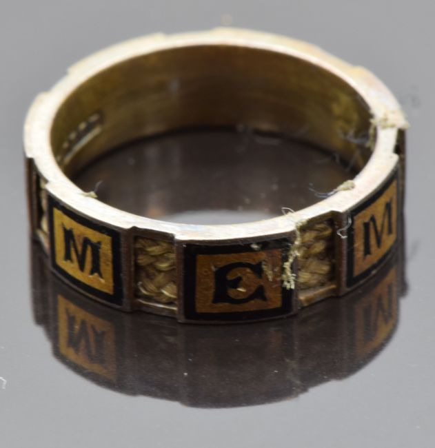 Victorian 15ct gold mourning ring set with plaited hair and raised black enamel sections reading "Memory", size K/L, 2.81g
