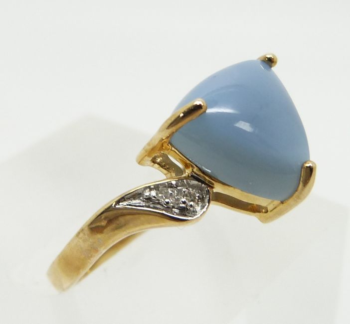 A 9ct gold ring set with a trilliant cut blue fire opal cabochon and diamonds, 2.9g, size N