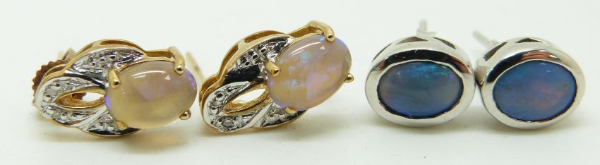 Two pairs of 9ct gold earrings set with black opal cabochons, 3.7g