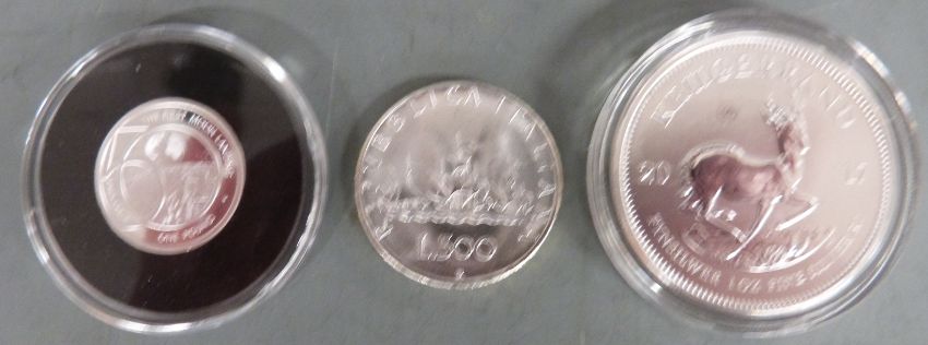 South African Mint one ounce silver Krugerrand with certificate together with an Alderney proof silver £1 coin and a 500 Italian Lira
