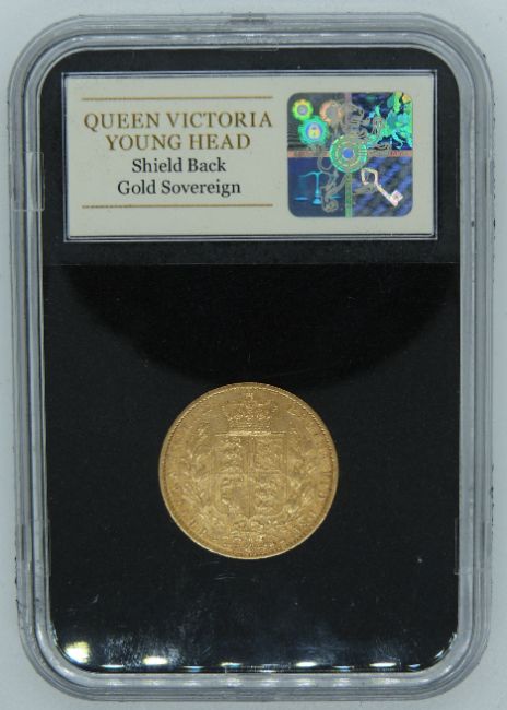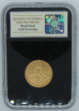 Queen Victoria 1864 young head, shield reverse gold full sovereign, die No.50, slabbed, in deluxe wooden case