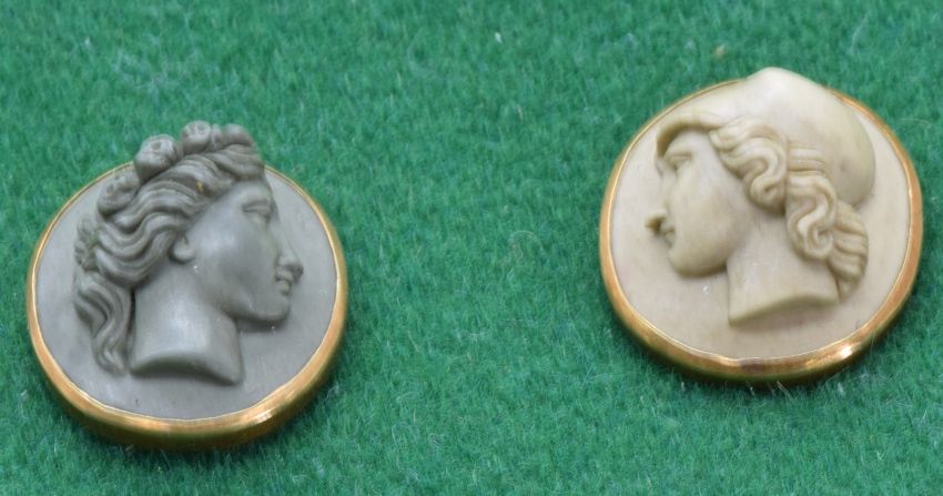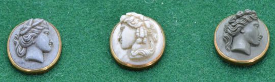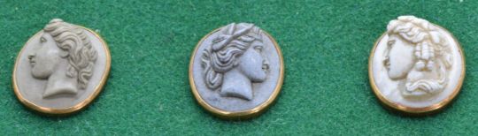 A set of six Victorian lava cameo buttons, each set with oval vari-coloured lava cameo panels carved to depict classical portrait profiles, 1.6 x 1.4cm