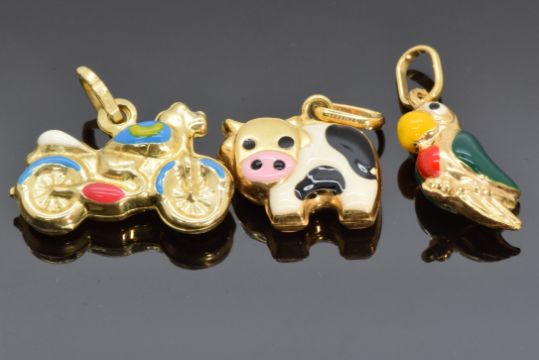 Three 9ct gold and enamel charms, one in the form of a cow, one a parrot and the other a motorbike, 3.7g