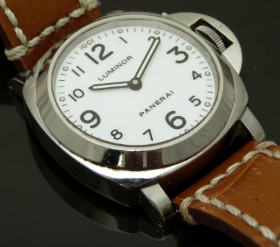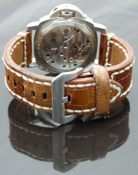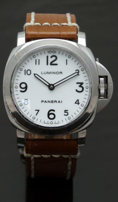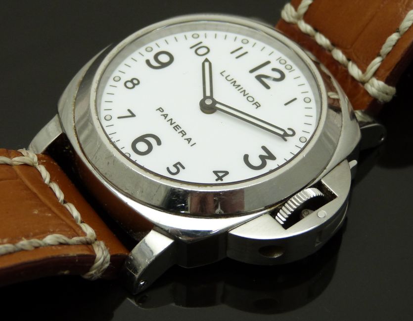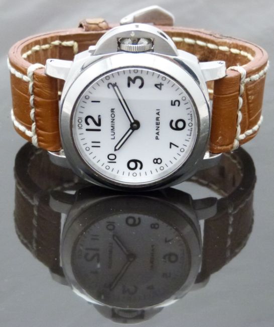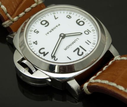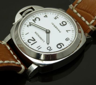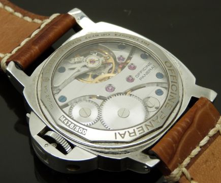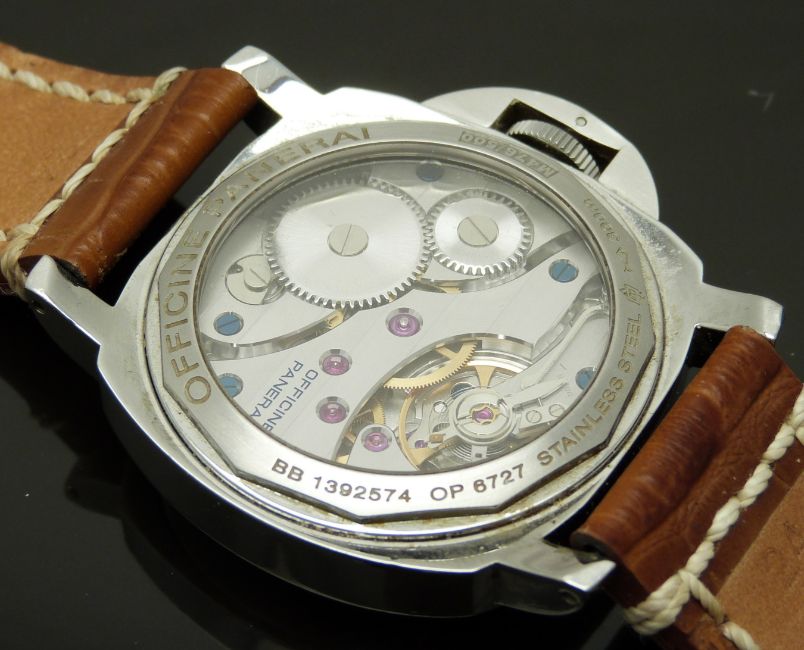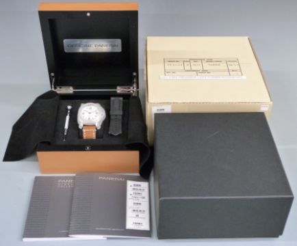 Panerai Luminor Marina gentleman's diver's wristwatch ref. OP 6727 with luminous hands, black Arabic numerals, white dial, clear exhibition case back, stainless steel case and signed movement, on brown leather strap, limited edition 476/500, case diameter 43mm, serial number BB 1392574, in original wooden case with outer box, card delivery box, guarantee card and booklet, rubber strap and case tool.