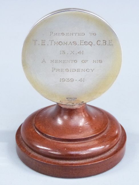 1939-41 Institute of Transport silver presentation medallion or trophy, with enamel decoration to front, engraved to rear 'Presented to T.E.Thomas Esq CBE 13.X.41 A Momento of His Presidency 1939-41', also marked Sterling Silver, height 9.5cm, in original fitted Goldsmsiths & Silversmiths company Ltd box