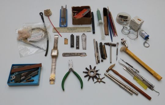 A collection of watch maker's tools, eye glasses etc together with a wooden fitted pocket watch collector's/repairer's case and a watch case pressing tool