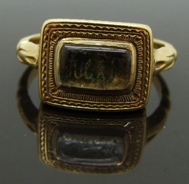 Victorian 18ct gold mourning ring set with plaited hair and wire initials to the central glass compartment, within a textured border, inscribed to inner band "March 18th 1896, Jan 29th 1915", size N, 3.93g