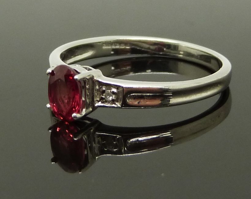 A 9ct white gold ring set with an oval cut synthetic ruby of approximately 0.5ct and diamonds, size N, 2.22g
