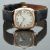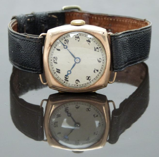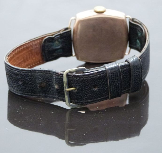 Centaur 9ct gold gentleman's wristwatch with blued Breguet hands, black Arabic numerals, silver dial and signed 15 jewel movement, on black leather strap, case diameter 29mm, serial number 5402.