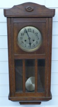Oak cased c1910 two train wall clock with bevelled glass panels, height 78cm