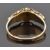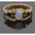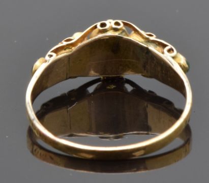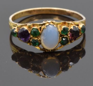 Victorian yellow metal ring set with a moonstone, emeralds and amethyst, size L