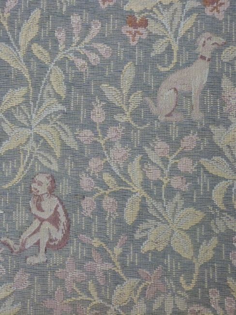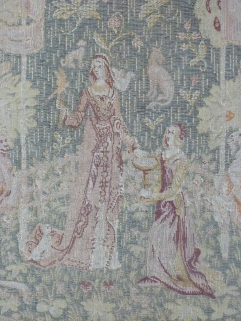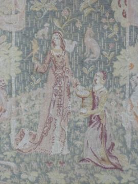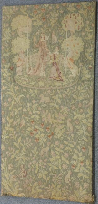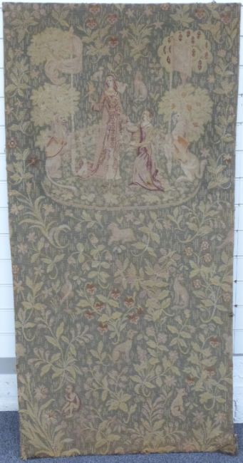 An 18th/19thC wool tapestry with figural decoration of two figures in a garden, animals and flowers, mounted on board, 167 x 80cm