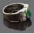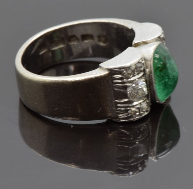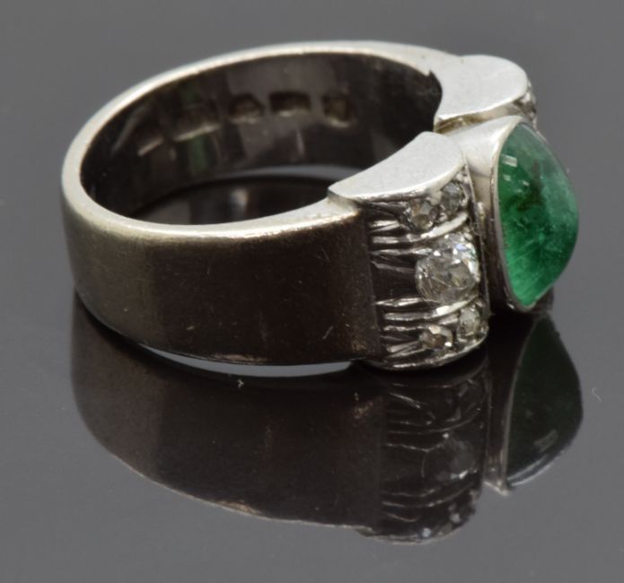 Art Deco 18ct white gold ring set with an emerald cabochon and six old cut diamonds, size J/K, 9.62g