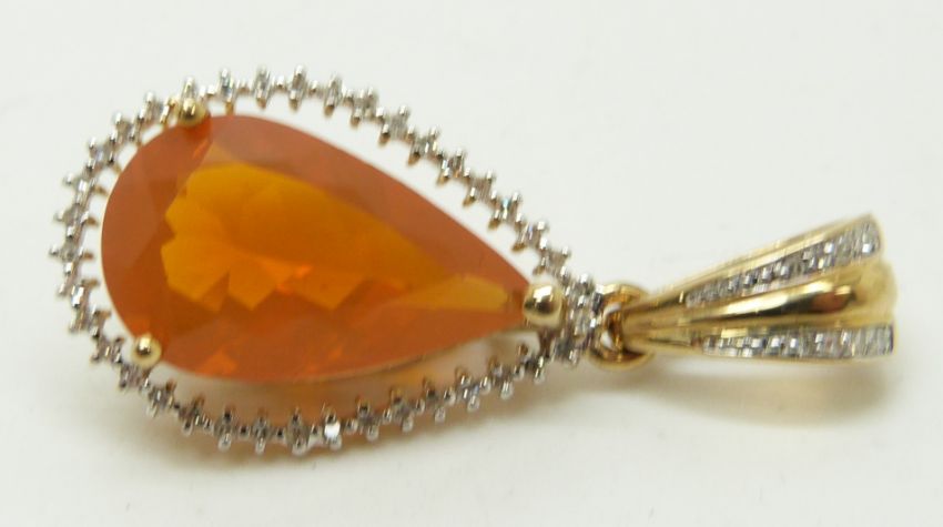 A 9ct gold pendant set with a pear cut Buriti fire opal and diamonds, 5.9g