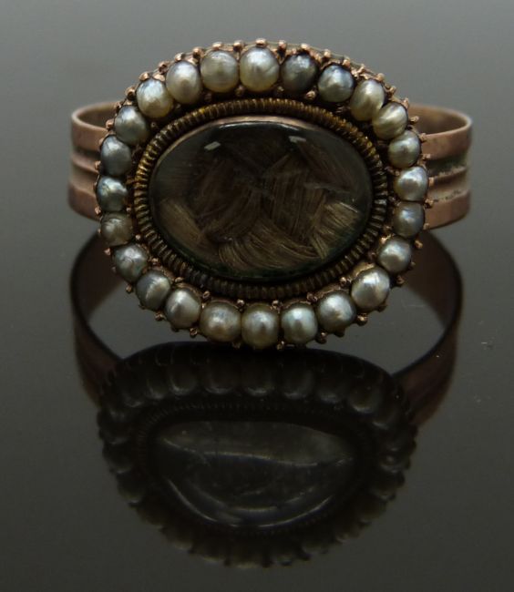 Georgian / Victorian mourning ring set with plaited hair surrounded by seed pearls, size Q/R, 3.54g