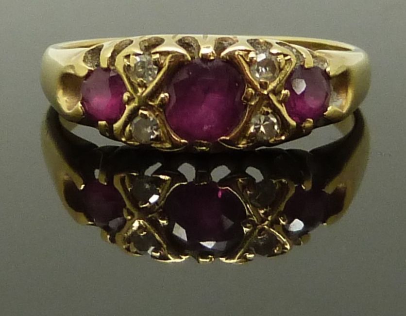 An 18ct gold ring set with rubies and diamonds, size K, 3.00g