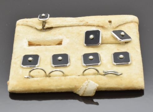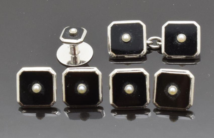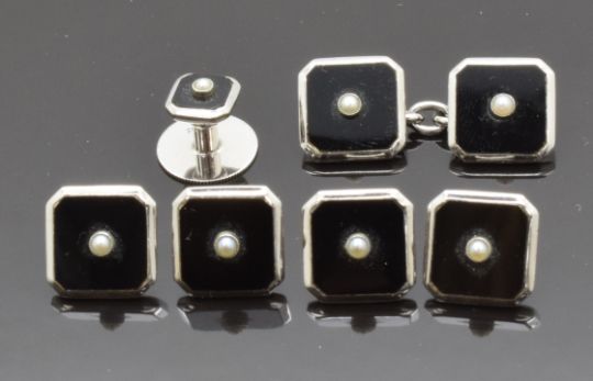 A set of 9ct white gold Art Deco buttons, a stud and a cufflink, all set with onyx and a pearl to each, 7.4g