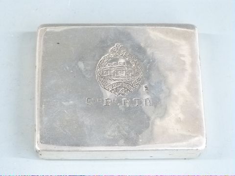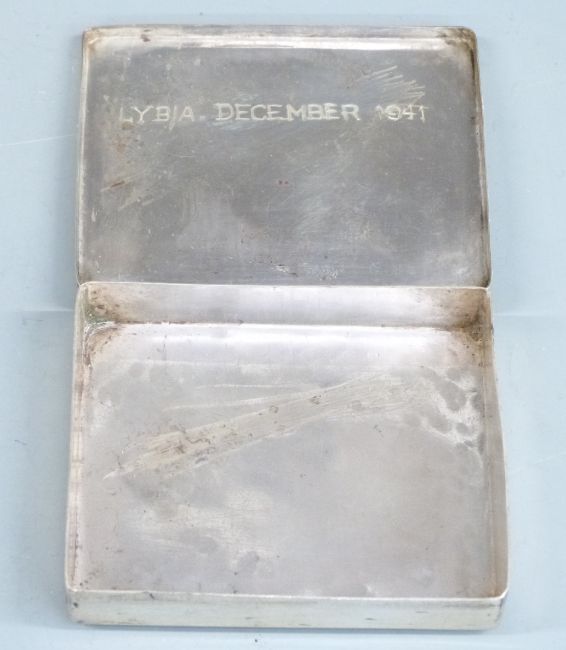 Egyptian white metal cigarette box with 5th Battalion Royal Tank Regiment engraving to lid and 'Lybia December 1941' to inside, width 9cm, weight 117g