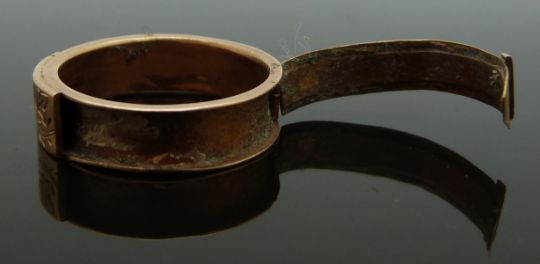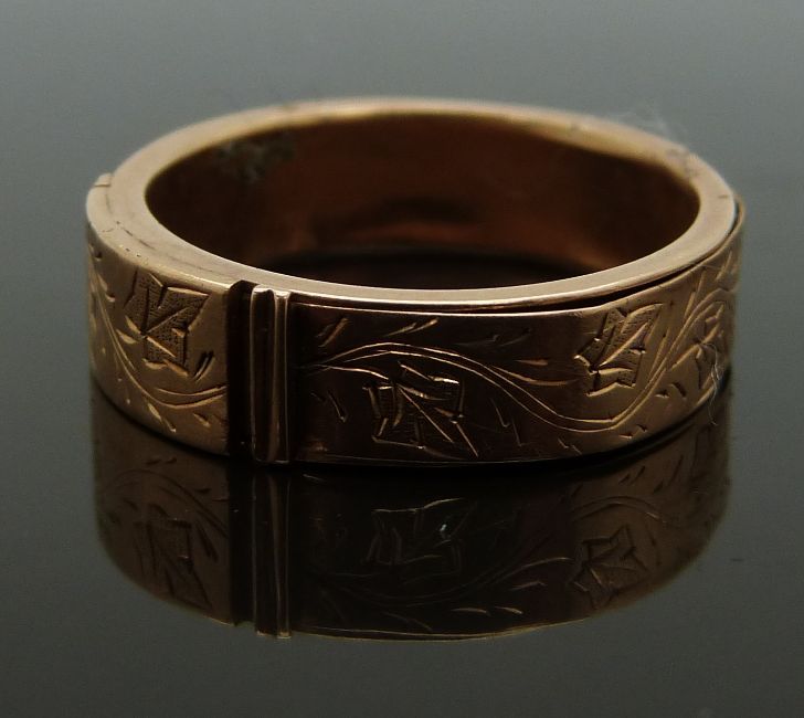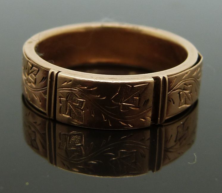 Victorian mourning ring with chased foliate decoration, opening to reveal a hollow section originally for hair, size Q/R, 3.07g