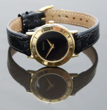 Gucci ladies wristwatch ref. 3000 with gold hands, black dial, inlaid black Roman numerals to the bezel, gold plated case and quartz movement, on black leather strap, case diameter 25mm, serial number 67 3000 024.