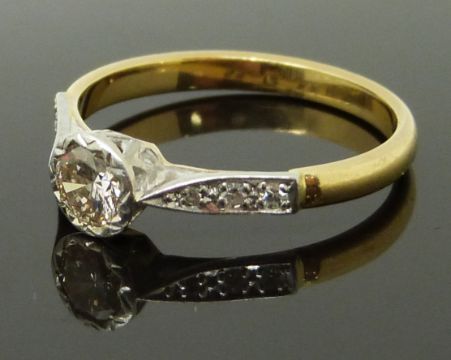 An 18ct gold ring set with a round cut diamond of approximately 0.6ct with diamond encrusted shoulders in a platinum setting, size R/S, 3.28g
