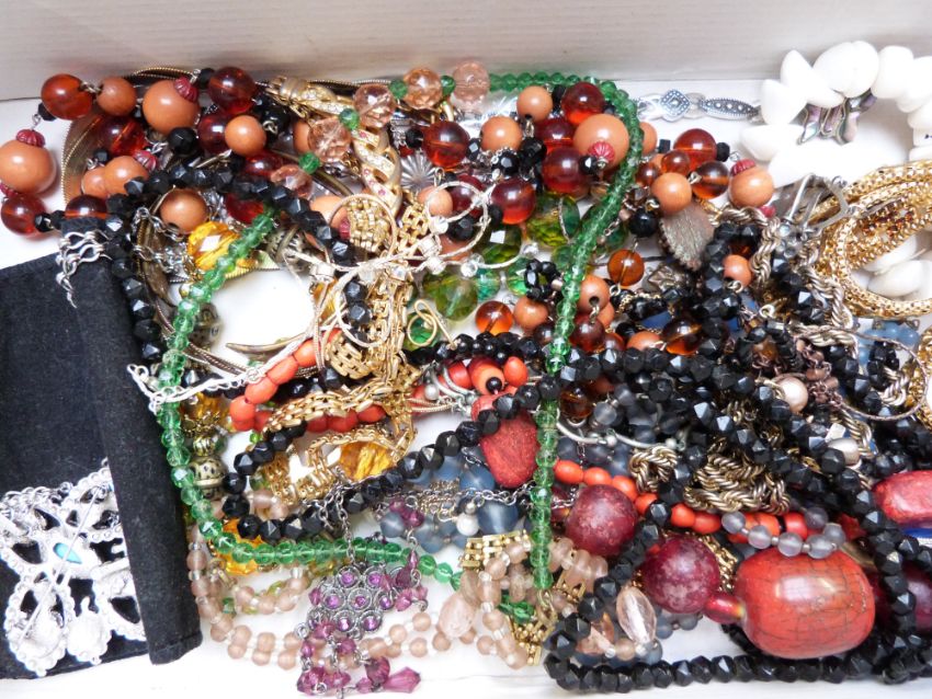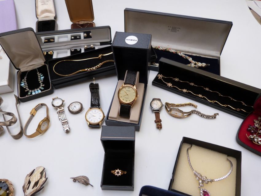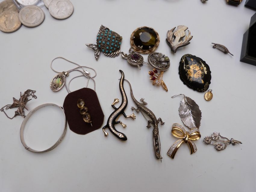 A collection of costume jewellery including silver watch, Miracle brooch, beads, coins, necklace made of watch parts, lacquer brooch, silver bangle, silver lizard brooch, Victorian silver brooch set with paste, etc