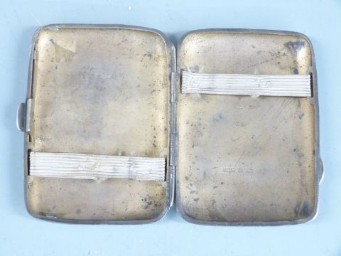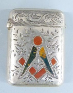 Hallmarked silver cigarette case, length 8cm, weight 60g together with an agate inlaid Masonic interest vesta case