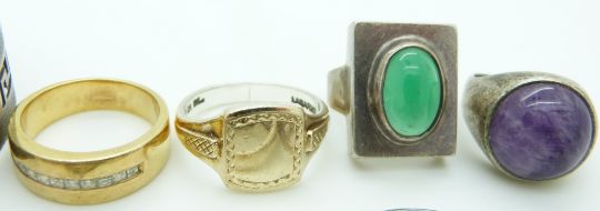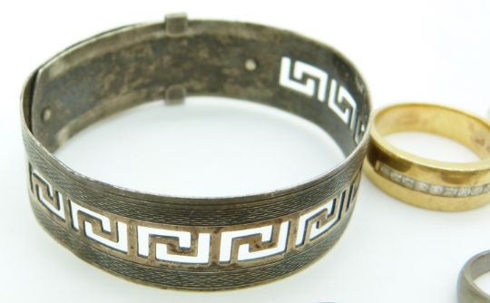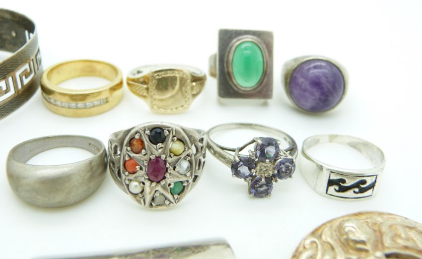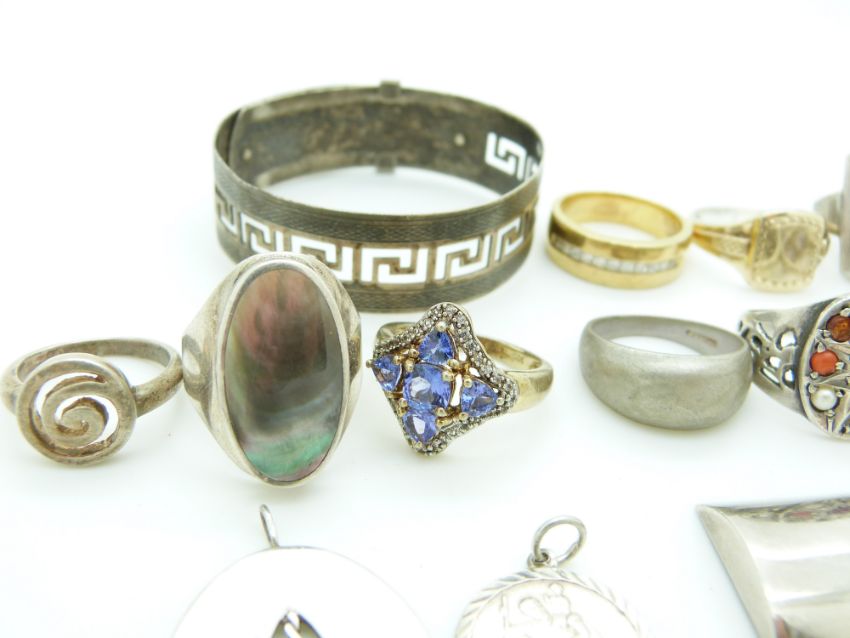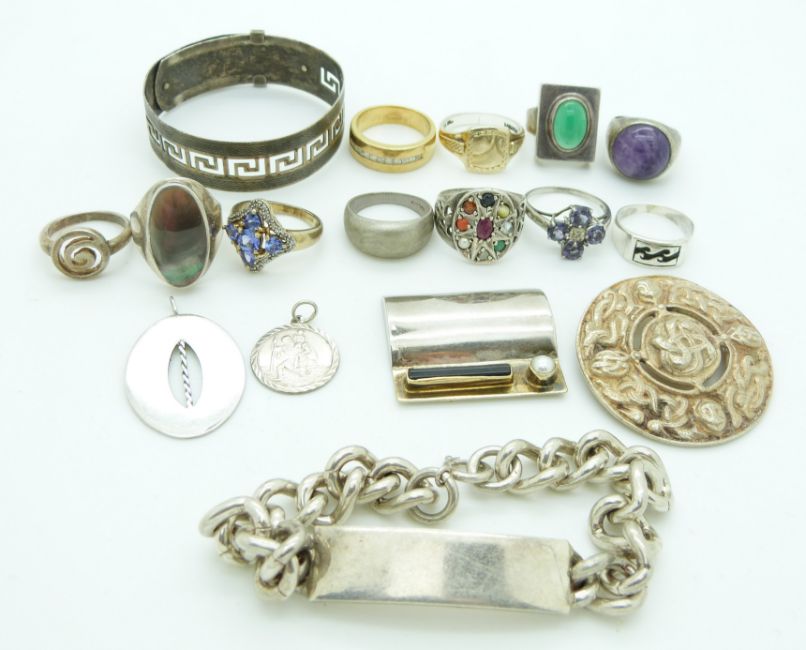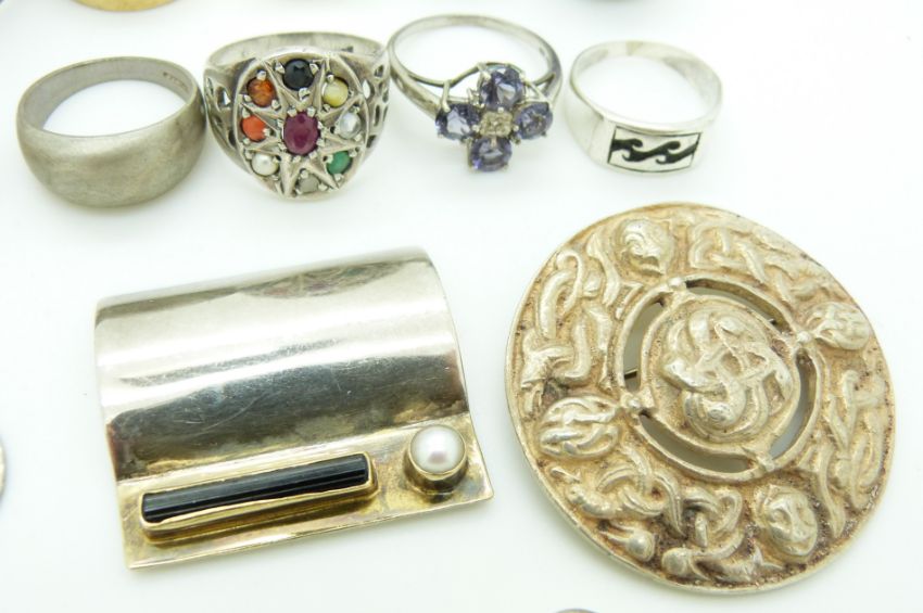 A collection of silver jewellery including rings, bangle, bracelet, brooch, etc