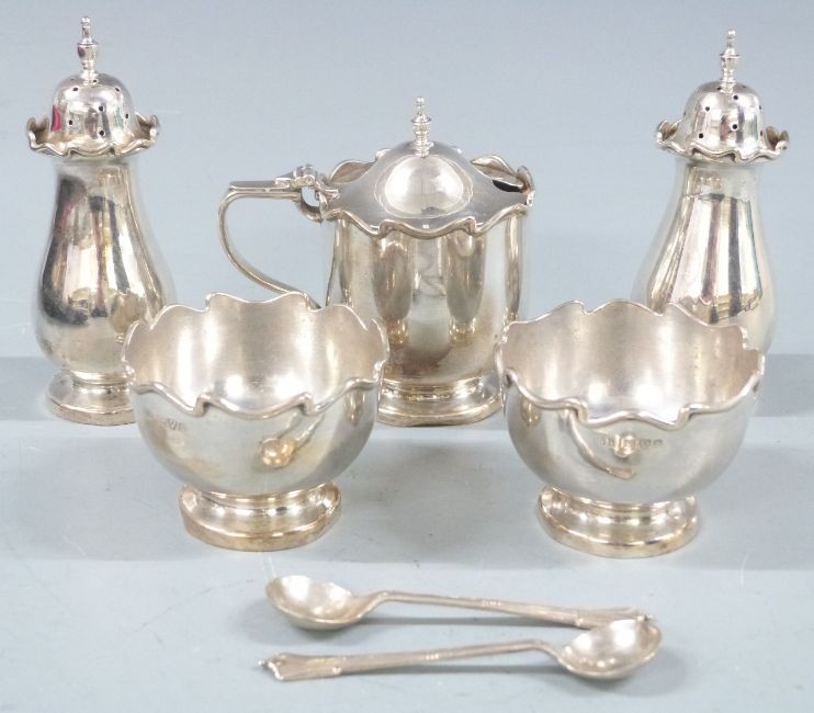 Cased Edward VII hallmarked silver cruet set comprising two peppers, two salts, mustard with green glass liner and two spoons, main pieces Chester 1905 maker Jay, Richard Attenborough Co Ltd, the fitted case marked Jays' to inside of lid, weight without liner 228g