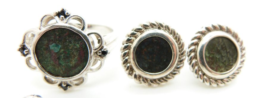 Three silver pendants, earrings and ring all set with 'Widow's Mite' coins