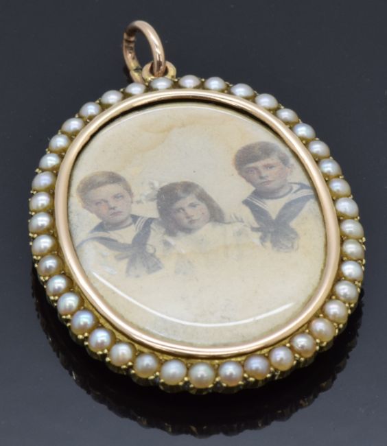 Edwardian 15ct gold pendant set with a photograph and engraved verso "To dear Nannie from Randolph, Philip and Betty Feb 24th 1910", in original fitted box