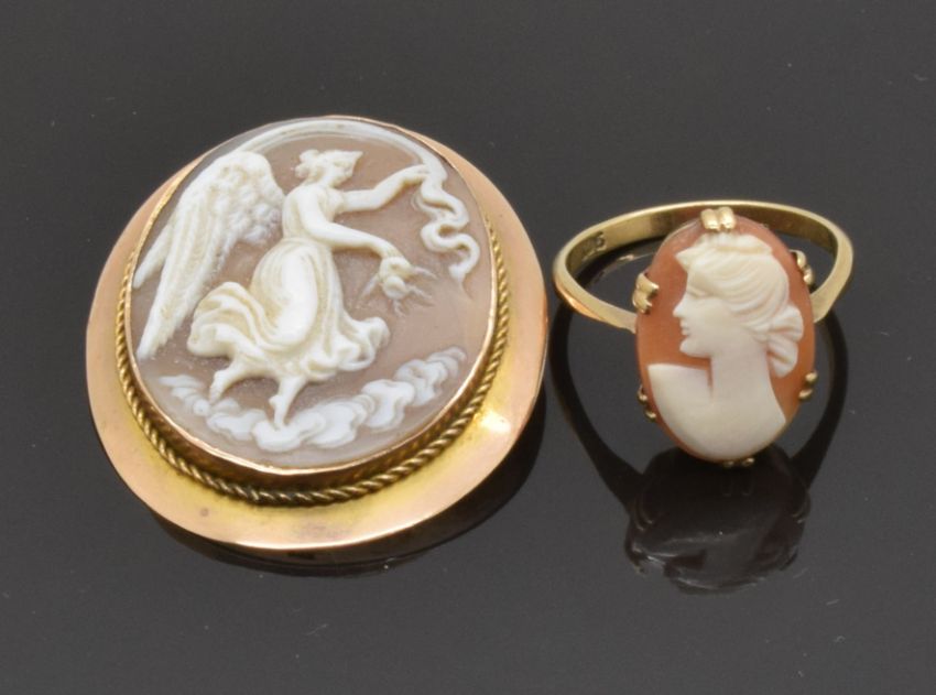 A 9ct gold brooch set with a cameo depicting an angel and a 9ct gold ring set with a cameo