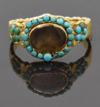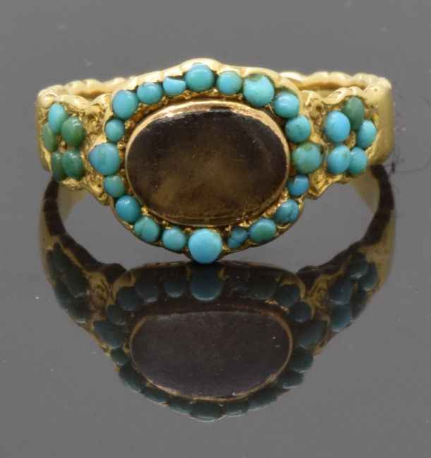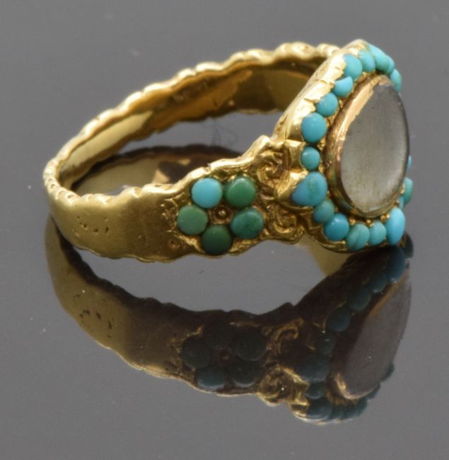 Victorian mourning ring set with hair to the central glass compartment/ locket surrounded by turquoise, size F, 3.19g