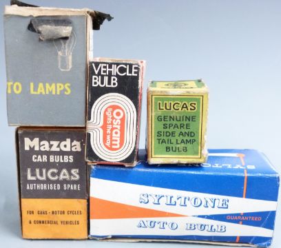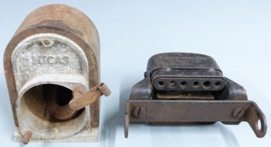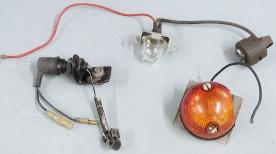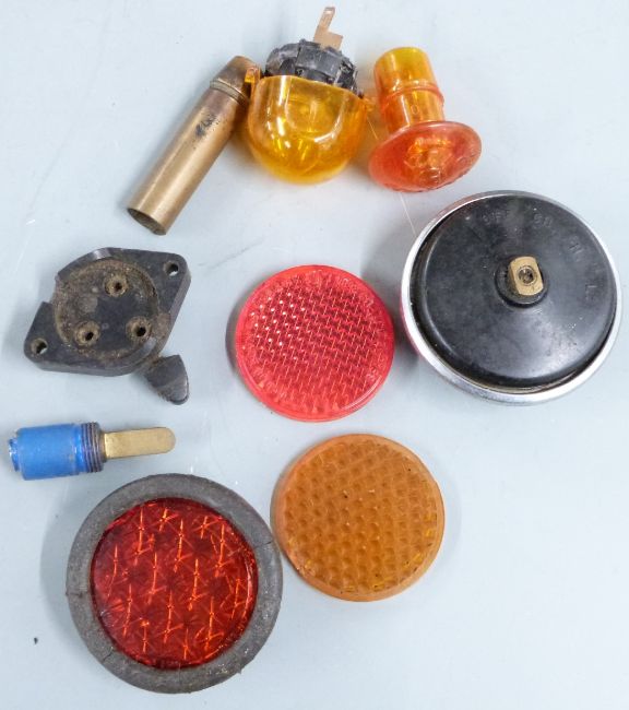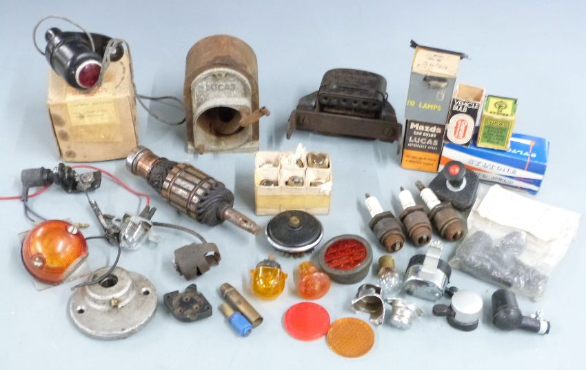 Collection of various largely 1920s/1930s vintage motorcycle electrical items to include Lucas MHA1 magneto body, Lucas voltage regulator, rear lights including new old stock in box, bulbs, dynamo armature, horn buttons etc