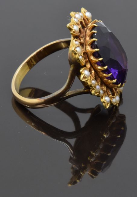 Edwardian 9ct gold ring set with a cushion cut amethyst surrounded by seed pearls, size P/Q, 8.23g
