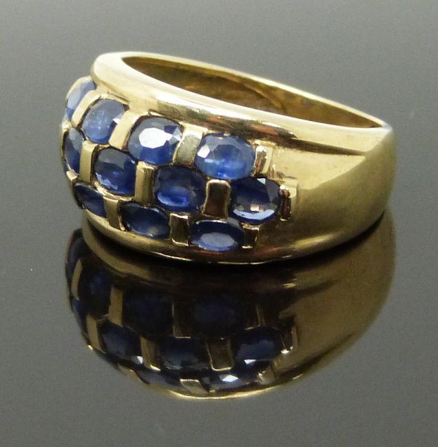 A 9ct gold ring set with oval cut sapphires, size M/N, 4.90g