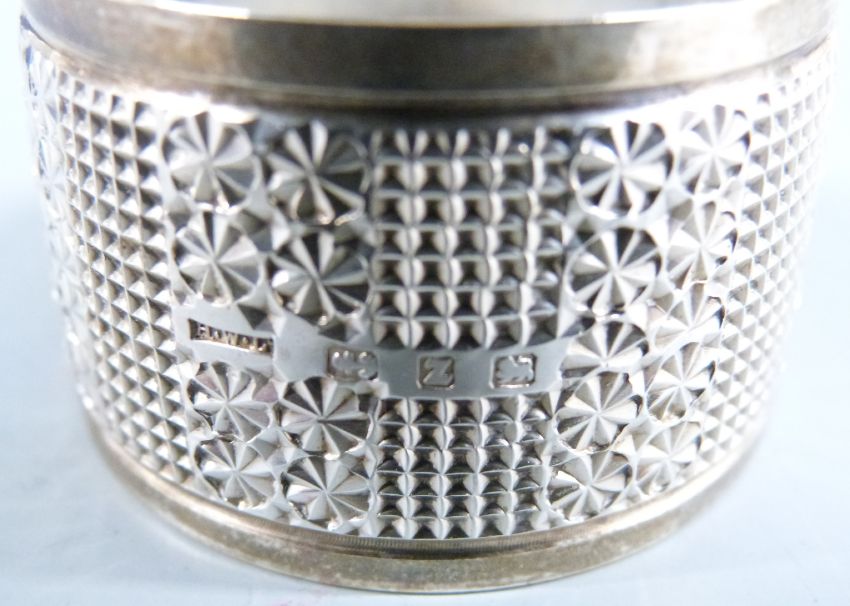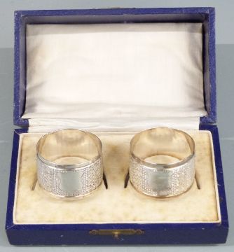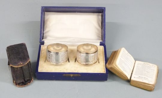 Cased pair of Victorian hallmarked silver napkin rings, Birmingham 1899 maker Henry Williamson Ltd, weight 56g, hallmarked silver mounted pair of miniature books and a further miniature book