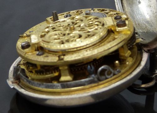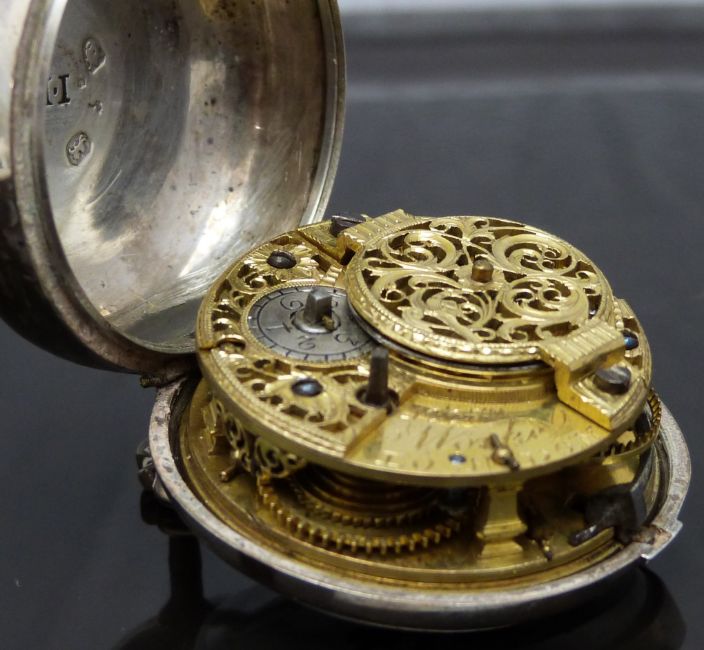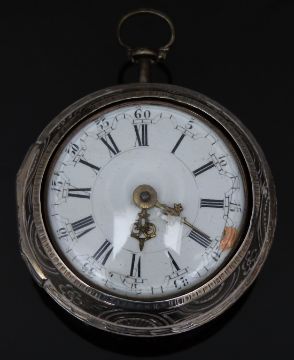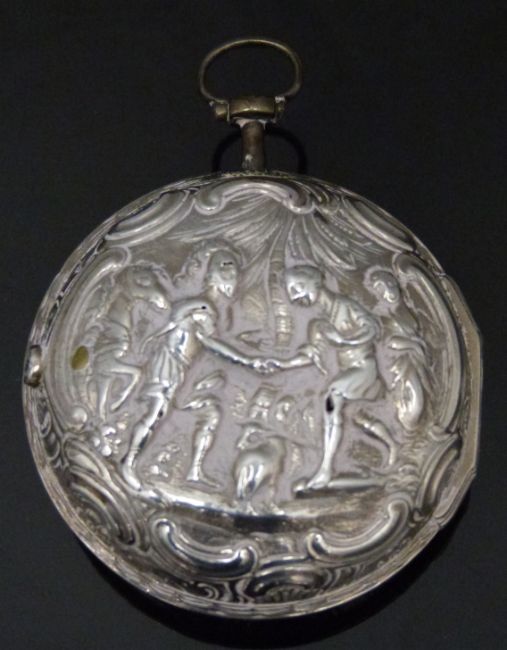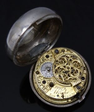 Worke of London hallmarked silver pair cased pocket watch with pierced gold hands, black Roman numerals, white enamel dial, embossed case featuring a figural scene and signed, pierced and engraved fusee movement, case diameter 50mm, serial number 12272.